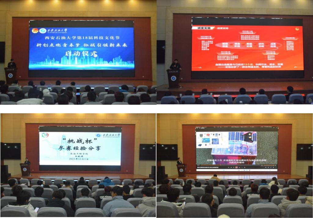 第十八届科技文化节启动仪式和2024年“挑战杯”大学生创业计划竞赛发布活动。活动邀请了“挑战杯”全国大学生课外学术科技作品竞赛主体赛全国二等奖《国潮文创正当时,赋能“红色”巧出圈——文创产品的红色文化传播调研》、“黑科技”专项赛恒星级奖项《观往知来新型智能管线安全模拟预测系统》、第十四届“挑战杯”陕西省大学生课外学术科技作品竞赛二等奖《井下医生——致密砂岩地层井壁稳定智能评价与随钻预测一体化系统》《操控式横纵两向铺压草方格生态修复机械》等优秀获奖团队成员讲述作品思路并分享参赛经验。