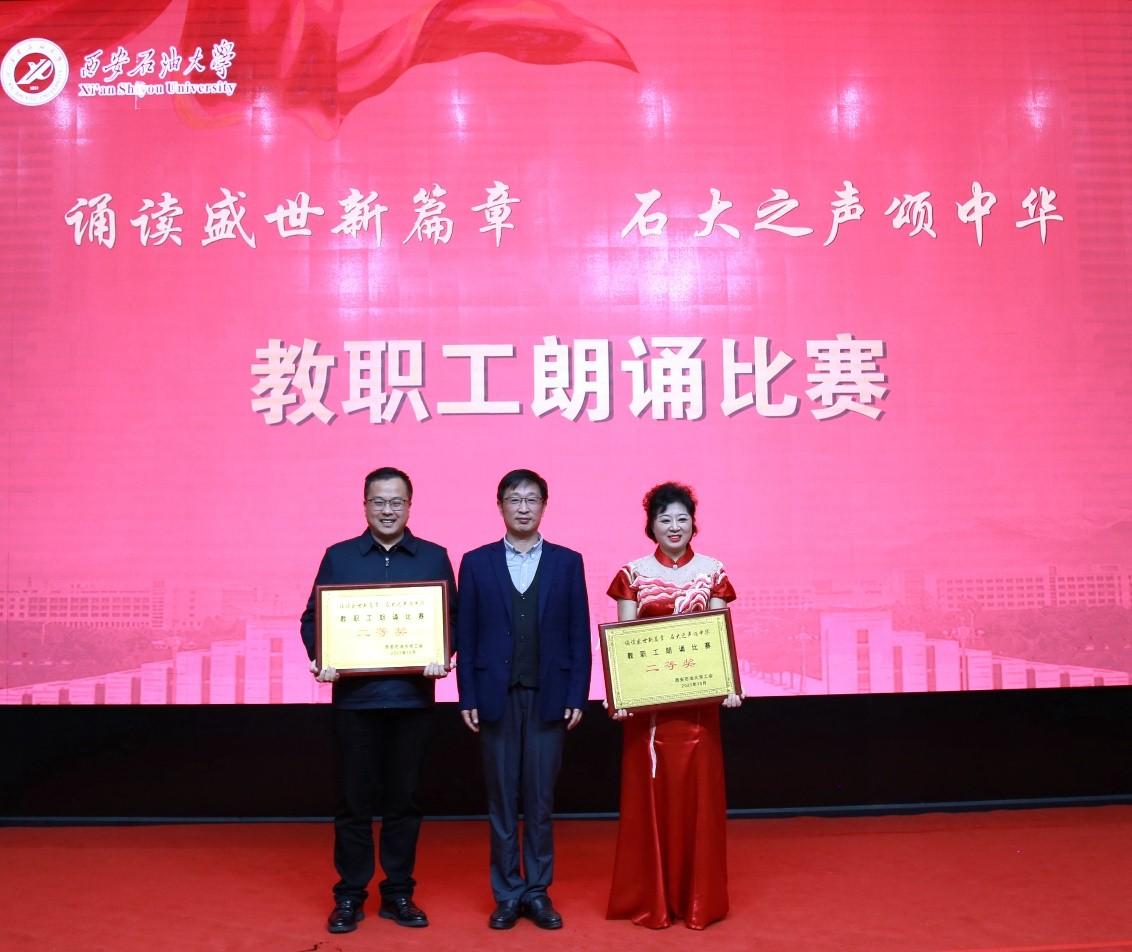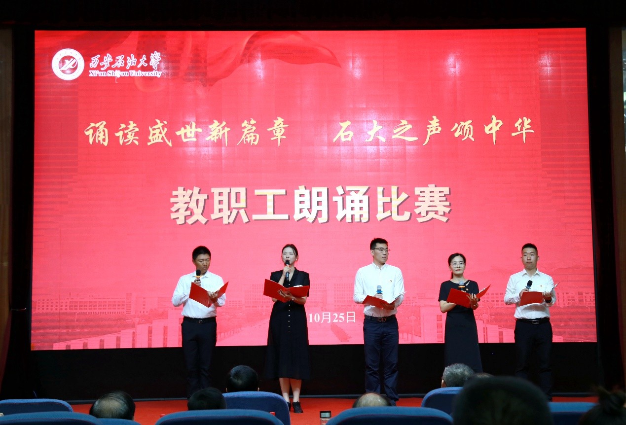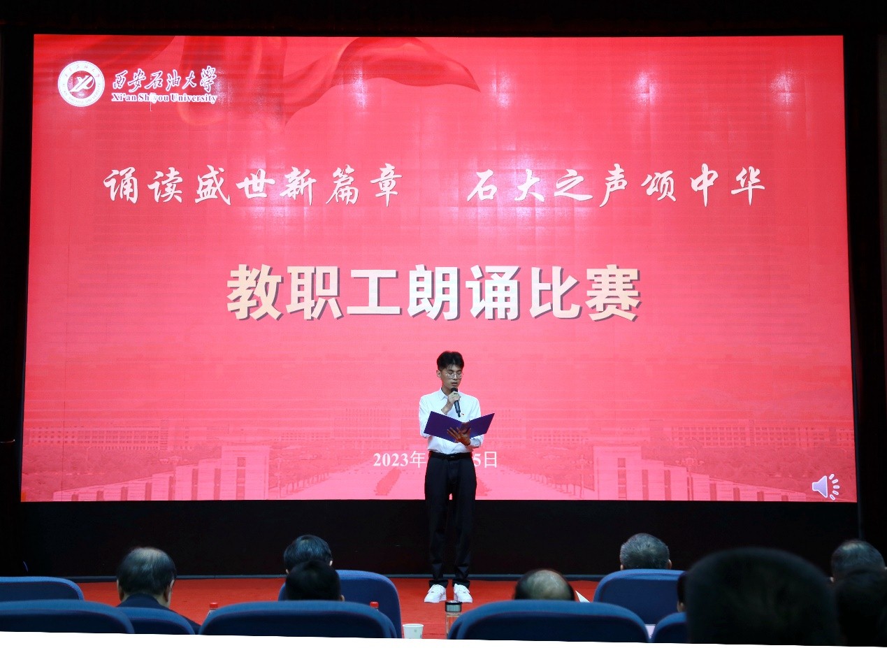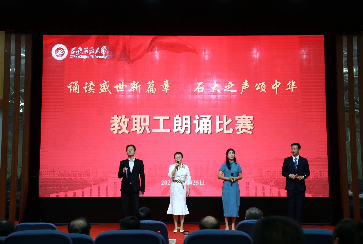 “诵读盛世新篇章 石大之声颂中华”教职工朗诵比赛在雁塔校区会议中心学术报告厅举行,校党委书记常江、副校长苏文甫出席了此次活动。22家部门工会选送了作品参赛,200余名师生观看了比赛。