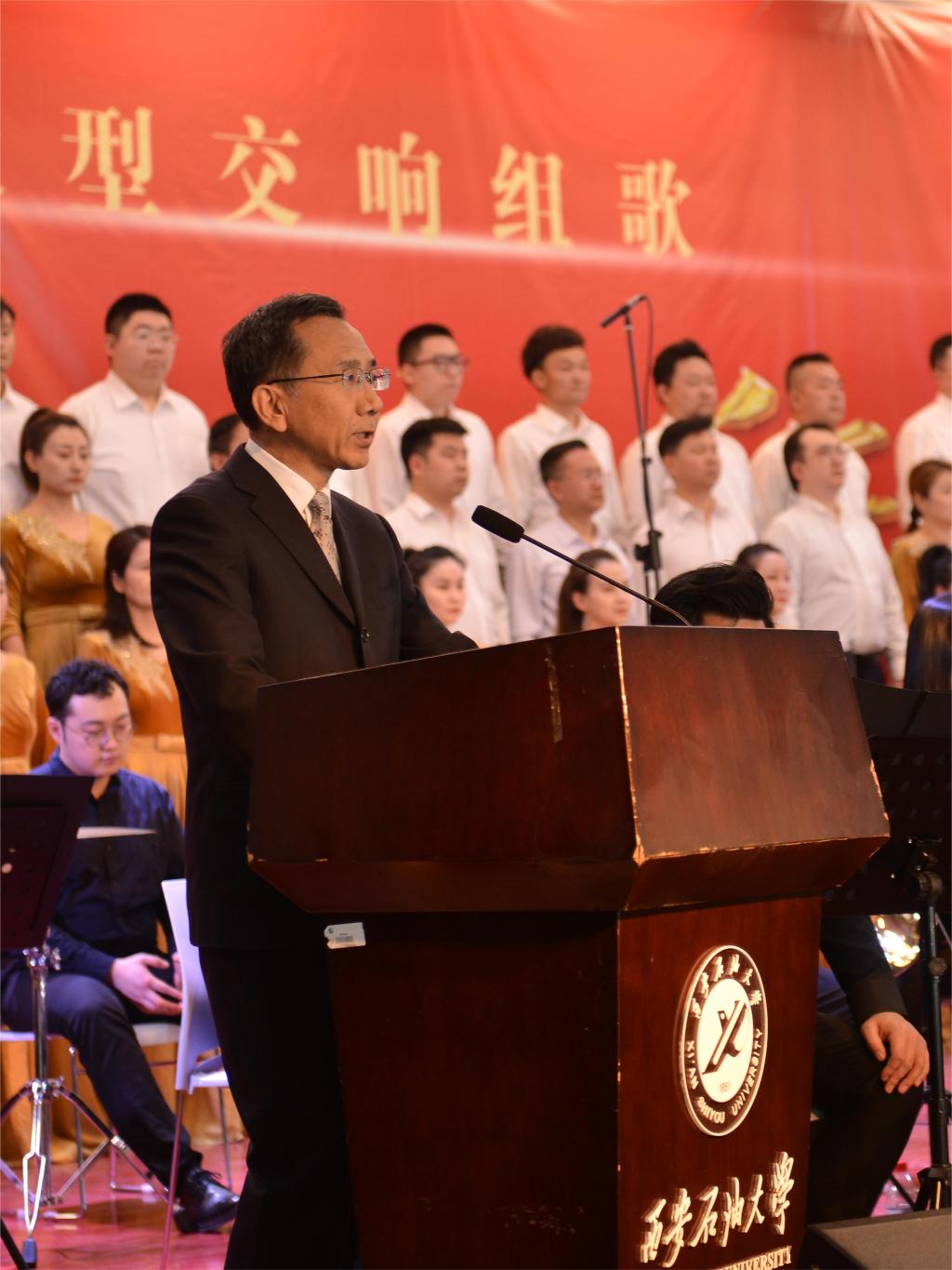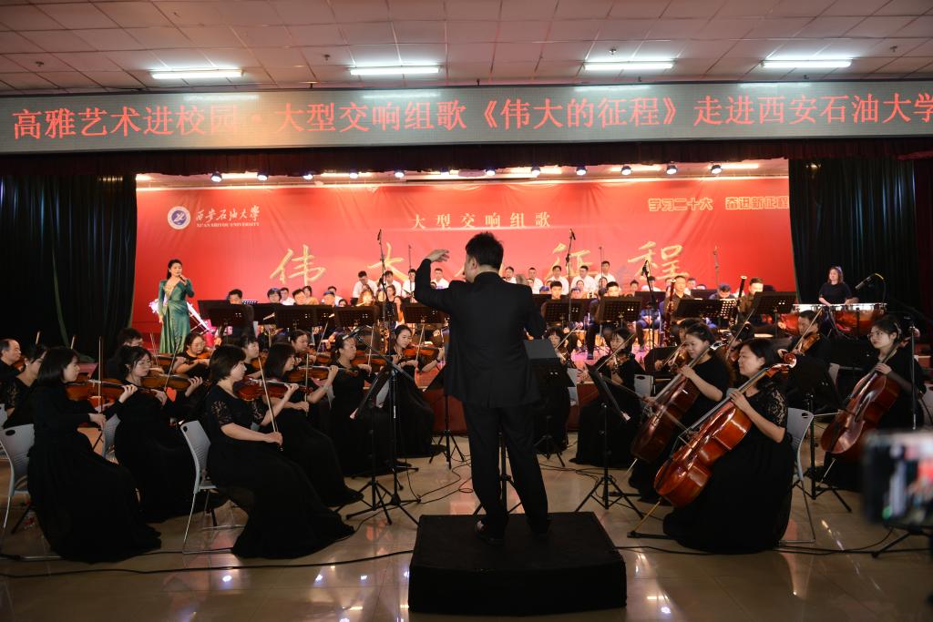 为深入学习贯彻党的二十大精神,加强红色文化宣传,将高雅艺术融入校园建设,切实提高学生人文素养和文化积淀,4月28日下午,由陕西省歌舞剧院有限公司创作的大型交响组歌《伟大的征程》在鄠邑校区腾辉大学生活动中心上演。校党委副书记张木出席活动,学生工作部、校团委负责人,各院(系)辅导员和学生共计800余人观看演出。