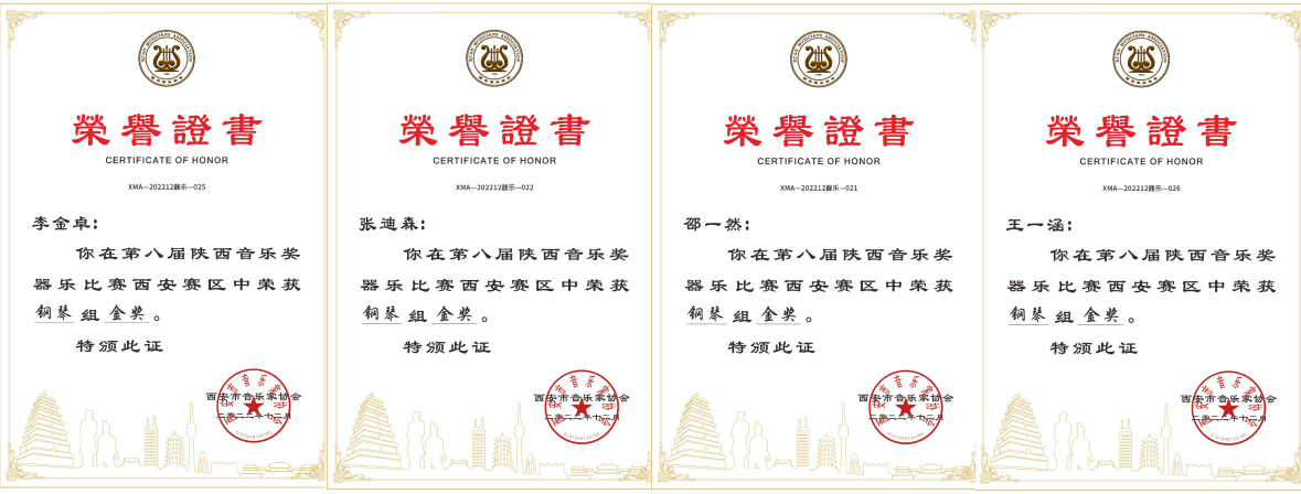 在钢琴组比赛中,李金卓、张迪森、王一涵、邵一然等4名同学荣获金奖,郑黎霏阳、关英杰、朱语函、张冰、刘美含、管华庆、龙虹粮、吕梦、丛伶芯、陈音汝等10名同学荣获银奖,范诗雨、郭书语、康鑫、黄捷航、吴韩雪等5名同学荣获铜奖。