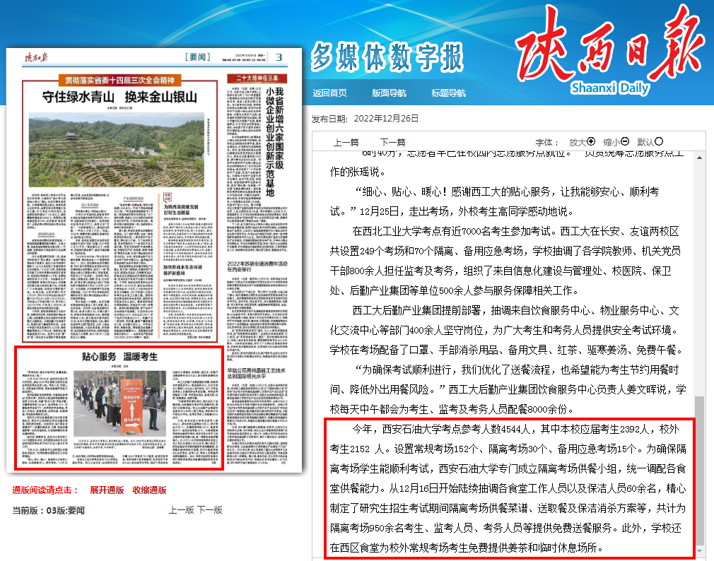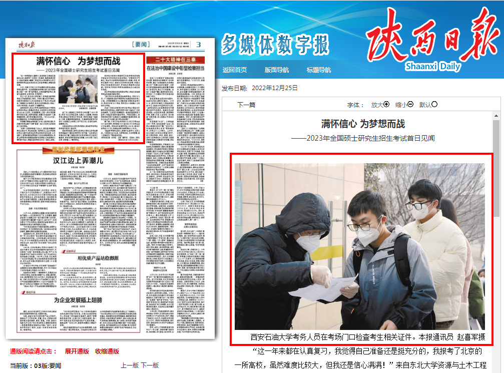 研究生招生考试得到了陕西日报、陕西广播电视台、“学习强国”陕西学习平台、澎湃新闻、华商报、陕西省教育厅官微等省级主流媒体和上级部门的多次报道,其中,12月25日、26日,陕西日报两次报道德州扑克