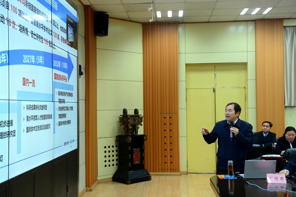 李天太作实验室建设计划汇报,他从实验室基本情况、建设目的与意义、研究方向和研究内容及预期目标、队伍建设及人才培养计划、实验平台建设与经费和管理运行机制等六个方面进行了全面详细地阐述。