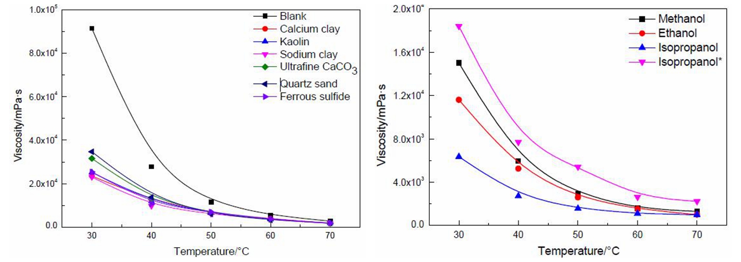 在本论文中,该团队使用水杨酸作为配体制备的金属配合物作为外源催化剂,粘土作为原位催化剂的代表,模拟了外源和原位催化剂形成的复合物,考察了它们在水热裂解中的协同催化降粘性能。粘土-水杨酸合铜复合物的催化剂效果最佳,并体现出外源和原位催化剂的协同催化效应。0.2 wt%催化剂和30 wt%乙醇供氢剂在180℃反应4h,降粘率达到91.5%,温度比传统反应温度低70℃左右。