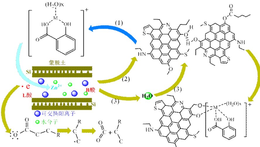 对反应后稠油的组分研究表明,稠油中的大分子化合物在反应后裂解为低沸点的小分子,胶质和沥青质含量减少,饱和烃和芳香烃含量增加。利用苯酚、噻吩、喹啉、苯并噻吩等模型化合物研究了稠油中分子可能发生的反应,证实了反应过程中稠油大分子中的C-C、C-N和C-S键的断裂,提出了粘土-水杨酸合铜复合物催化反应的机理。