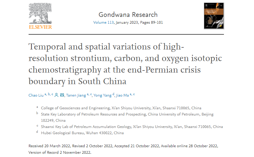 教师刘超在国际地学顶级期刊Gondwana Research在线发表了题为“Temporal and spatial variations of high-resolution strontium, carbon, and oxygen isotopic chemostratigraphy at the end-Permian crisis boundary in South China”的学术论文,探讨了二叠系/三叠系之交生物大灭绝的相关重要科学问题。
