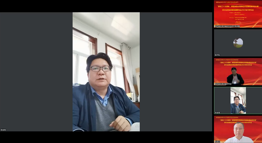 在服务陕西乃至全国经济发展过程中作出的努力和贡献的力量。张荣军指出,党的二十大报告明确提出增强消费对经济发展的基础性作用,如何促进新业态新模式健康发展,持续增强消费对经济发展的基础性作用,为巩固经济回稳向上态势提供支撑,是当前理论界和实务界都关注的重要问题。省改革发展研究会积极响应党中央号召,围绕党的二十大精神开展“增强消费对陕西经济发展的基础性作用”的学术研讨,坚持以国家重要政策为中心的研究导向,切实发挥了社科研究组织的作用,为陕西加快高质量、高效率、跨越发展,高水平建设西部强省,展现了社科担当、贡献了社科力量。