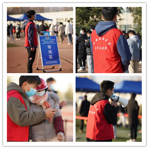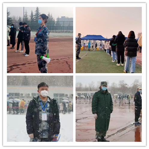 应化2003班的王梓馨就是其中一员,为同学们指引排队位置,协助医护人员进行“一码通”查验,风雪天也不例外。谈及感受,王梓馨说,“我就应该站在这儿,甚至觉得我们来晚了,我们要对得起身上的这身军装”。