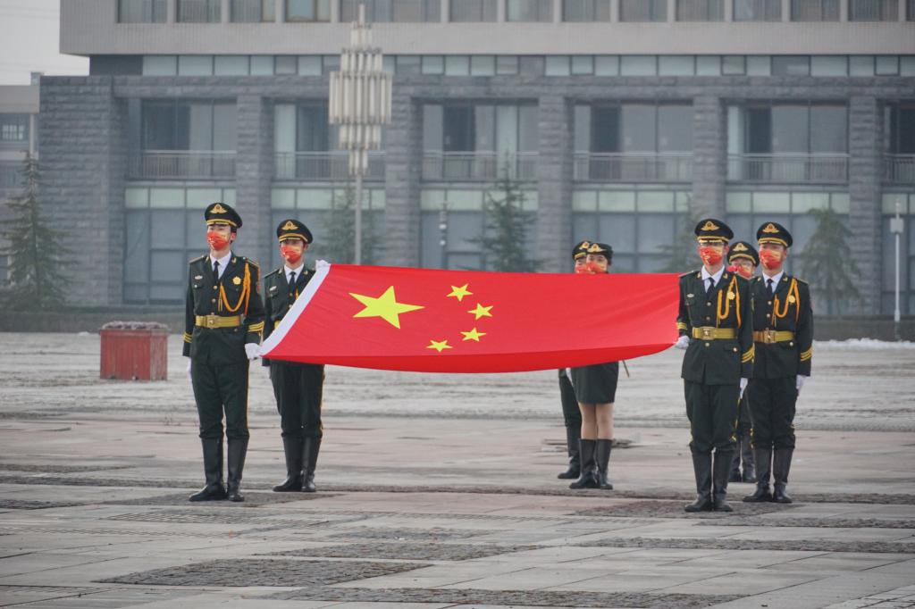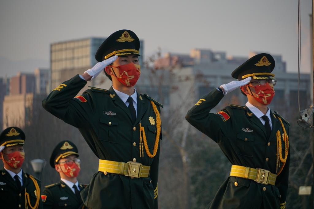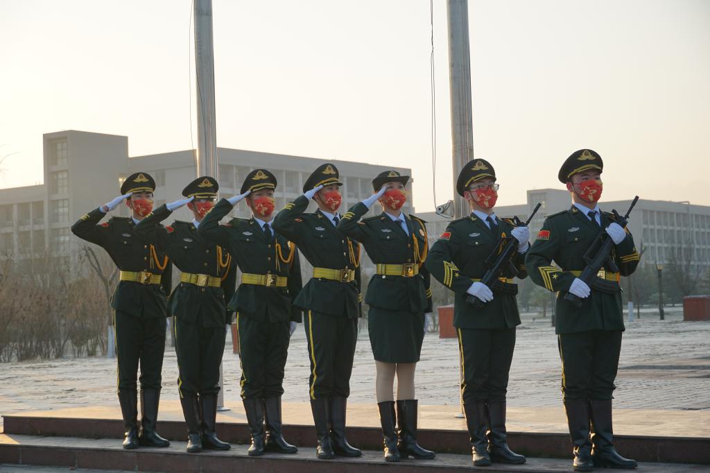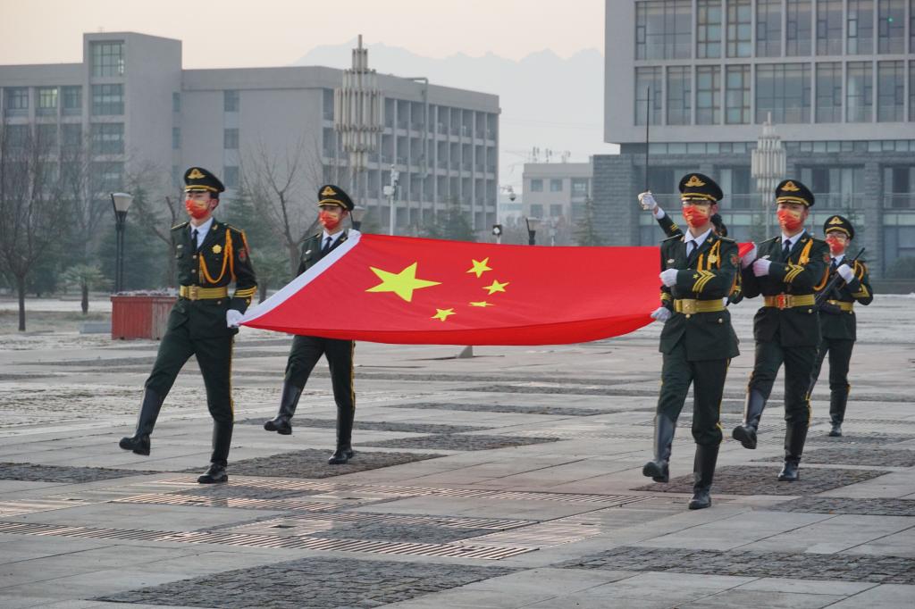 广场出发,护送着国旗正步走向旗杆。伴随着庄严的《国歌》,国旗护卫队队员将鲜艳的五星红旗高高托举,缓缓地升至最高点。在屏幕前的同学们怀着崇敬的心情,在宿舍站立,共唱国歌、行注目礼,深怀对祖国和人民的无限热爱与战胜本次疫情、攻坚克难的坚定信心。