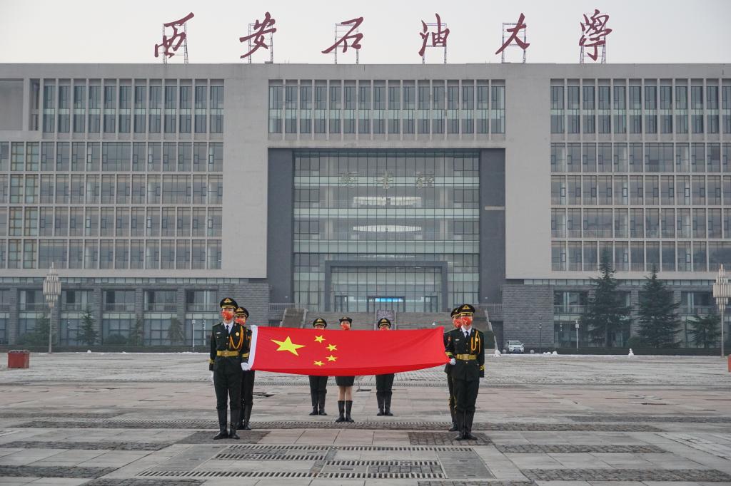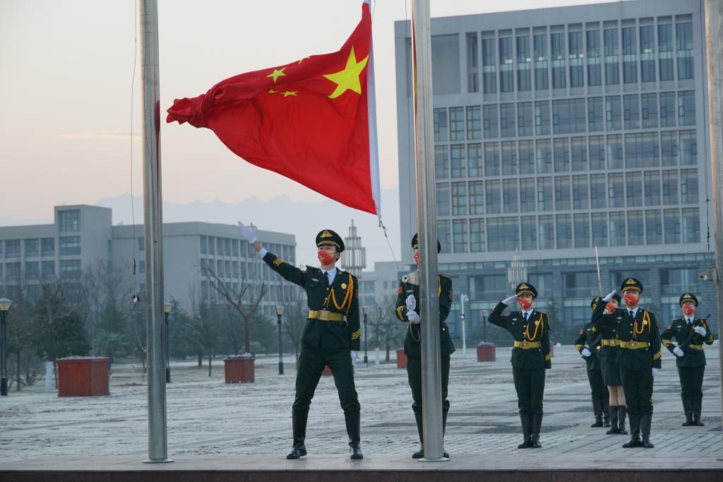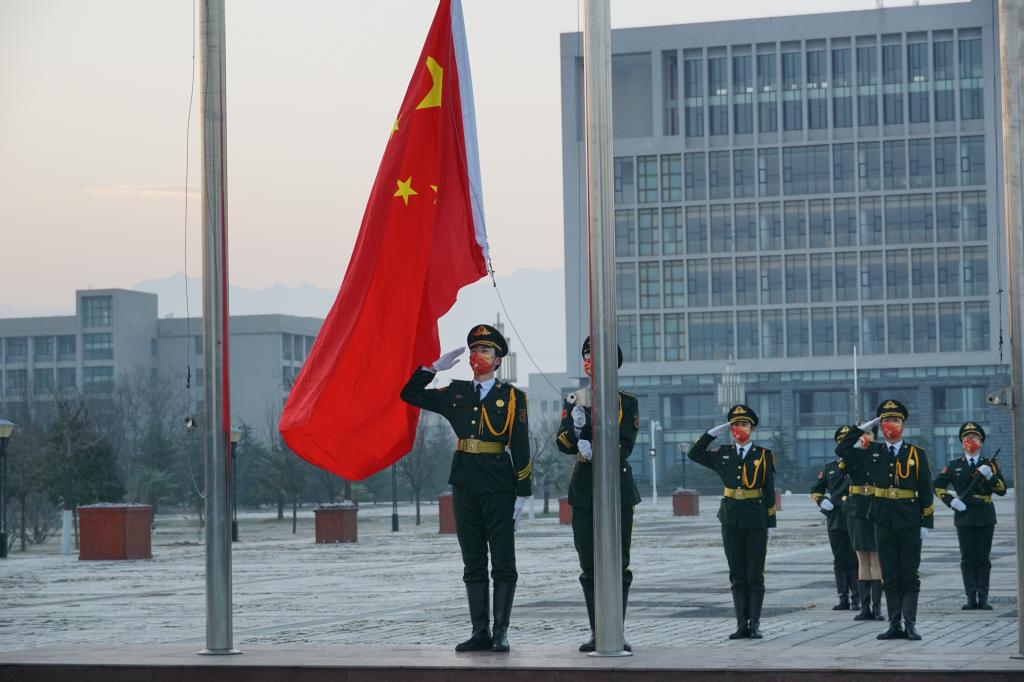 在鄠邑校区图书馆北广场举行以“共同抗疫,爱国力行”为主题的升国旗仪式。全校师生通过网络平台直播观看升旗仪式。