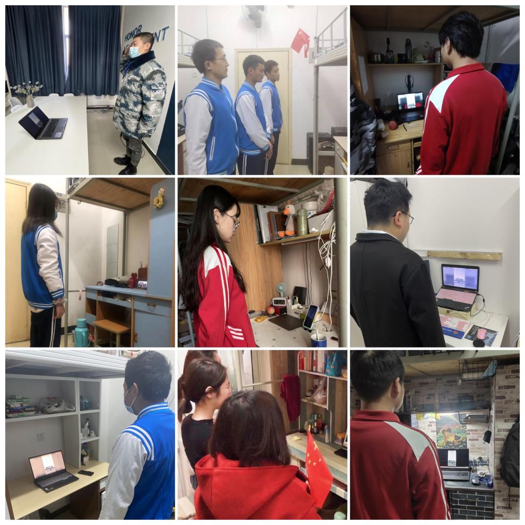 师生们在宿舍通过观看屏幕中冉冉升起的五星红旗,高唱国歌,行注目礼,表达对祖国的无限热爱与战胜本次新冠疫情的坚定信心。