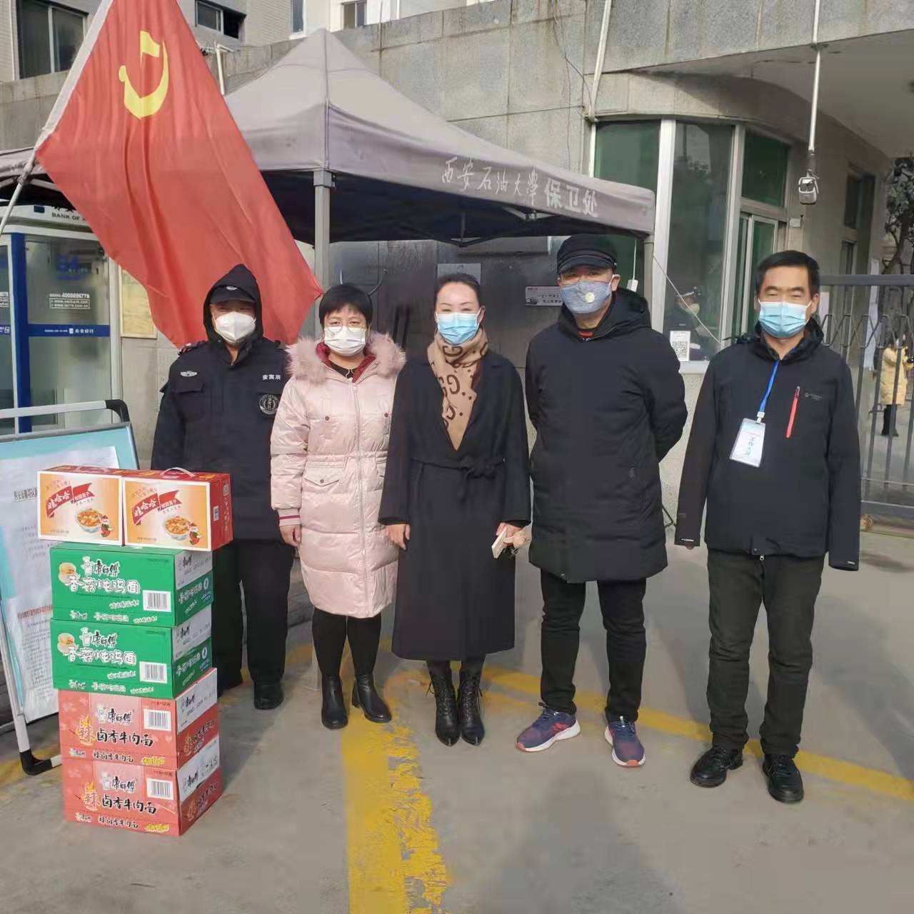 党委疫情防控决策部署。了解到后勤保障、核酸检测、安全保卫等一线工作人员工作繁忙顾不上吃饭、休息的实际,12月27日,创新创业中心先后为奋战在疫情防控一线的后勤处、校医院、保卫部(处)送去方便面、八宝粥等物资,为一线工作人员送去寒冬里的温暖,表达了对一线工作人员的感恩和敬意。苏文甫副校长在现场肯定了创新创业中心感恩一线送温暖的行动,表示此举鼓舞了一线工作人员的干劲,温暖了一线工作人员的心。