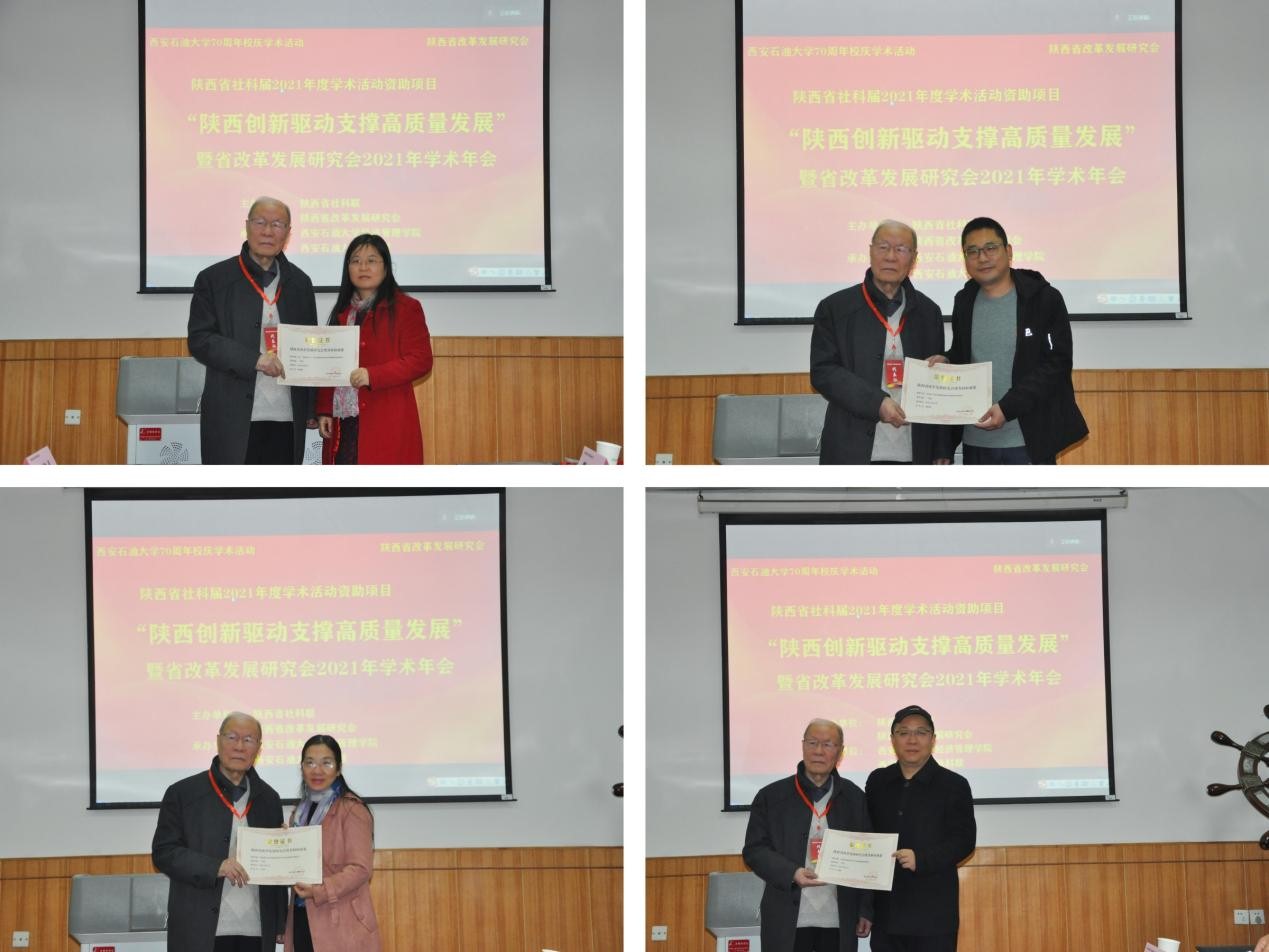 原院长、西安财经大学樊光鼎教授对陕西省改革发展研究会庆祝建党100周年优秀科研成果评奖活动进行了介绍,并宣读获奖文件,与获奖代表合影留念。