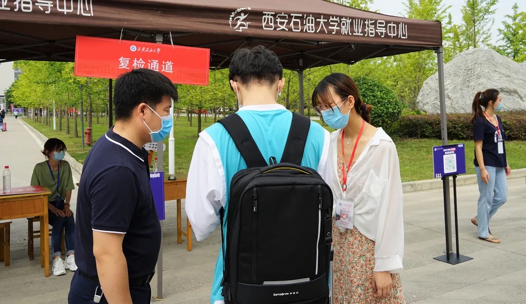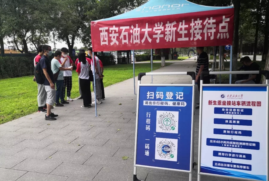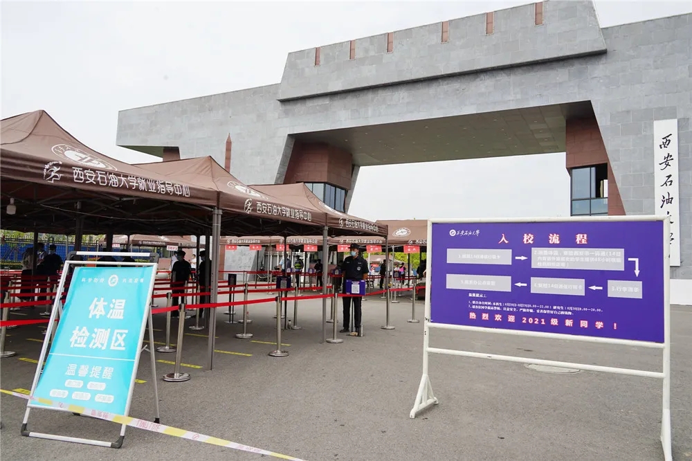 门口交通秩序疏导,审核14天行程码和核酸检测阴性报告,查验西安一码通,测温,消杀行李等任务,确保了2021级新生平安入校。