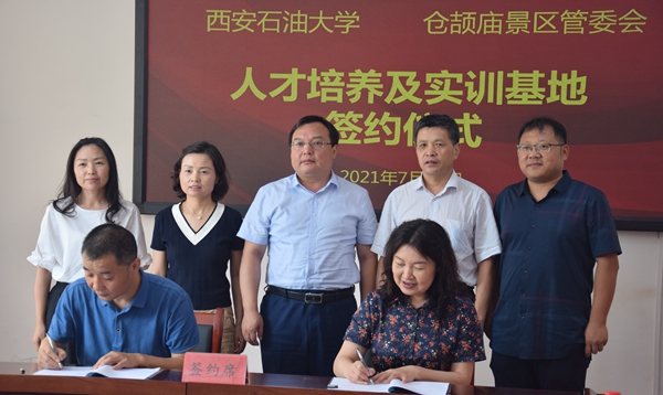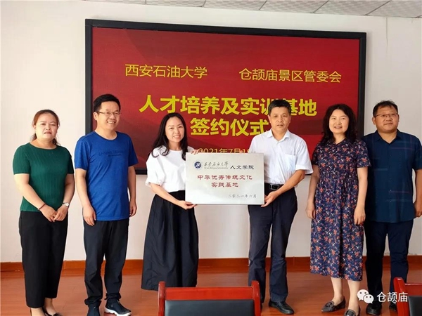 座谈会后,杨战社副校长分别与仓颉庙管委会、富平县文化馆负责人举行了挂牌仪式。双方代表分别签署了实践基地共建协议。
