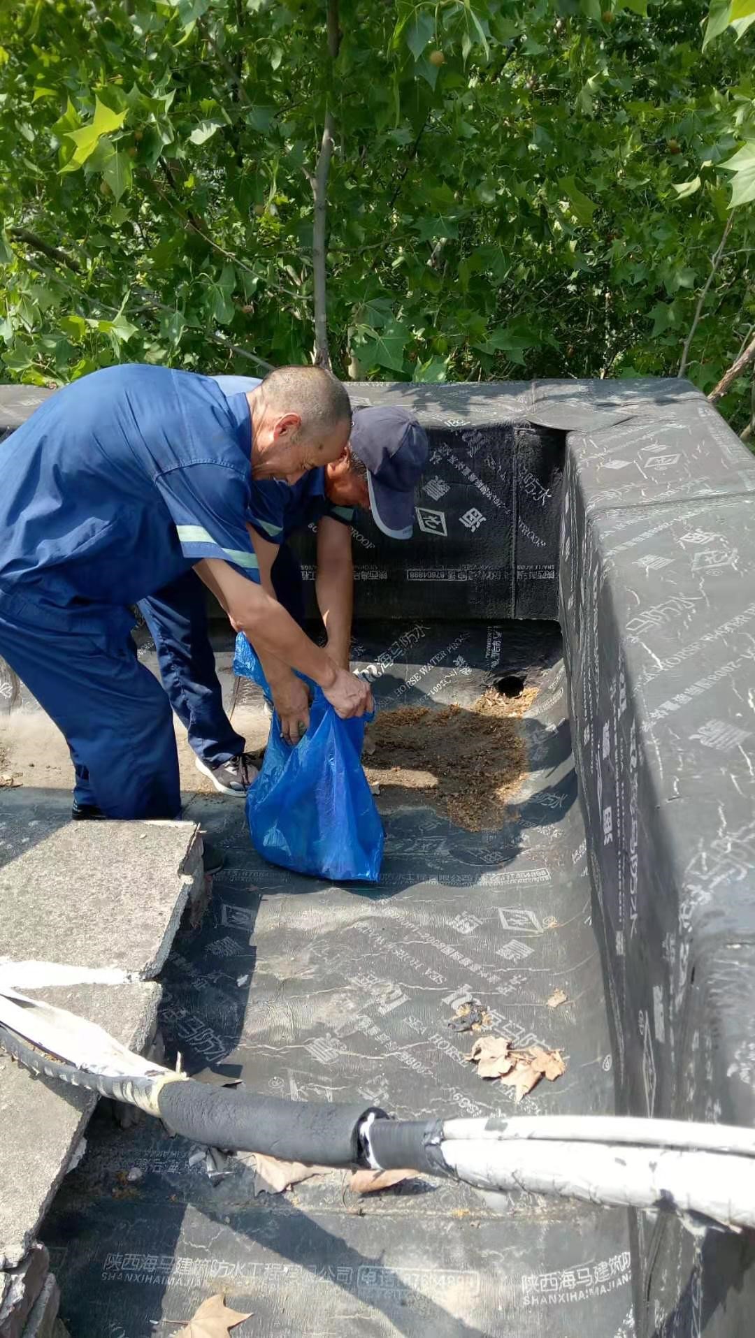 工作人员清理雁塔校区住宅楼楼顶雨水排水管口