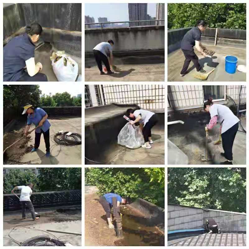工作人员在各楼宇楼顶屋面、排水(落水)管口进行杂物清掏