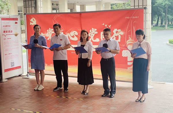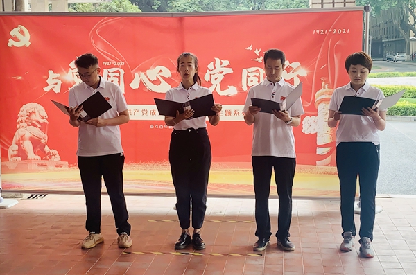 由蒋华义、孟开元、朱玮、张帆和唐媛芬五位党员朗诵的诗歌《可爱的中国》,拉开了诗歌朗诵和红歌献唱环节的序幕。接着参演人员依次登台,朗诵了诗歌《红船》和《永在》,演唱了红歌《唱支山歌给党听》和《奋进新时代》。饱含深情的朗诵和演唱,带领大家一起回忆了中国共产党走过的峥嵘岁月,赞美了中国共产党带领中国人民取得的丰硕成果,抒发了在场党员对党对祖国的无限热爱。