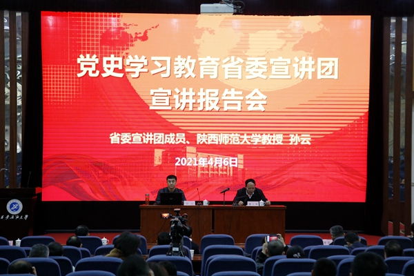 师生作了题为《学习百年党史,牢记初心使命》的宣讲报告。他从“深入学习领会习近平总书记关于党的历史的重要论述,充分认识开展党史学习教育的重大意义”“认真研读党史基本著作,全面了解中国共产党百年奋斗的光辉历程和历史性贡献”“深刻把握开展党史学习教育的重点”“开展党史学习教育,要学懂弄通做实习近平新时代中国特色社会主义思想”四个方面,介绍了开展党史学习教育的重大意义、重点内容和工作要求。他通过列举大量丰富翔实的史料和事例,深刻阐明中国共产党践行初心使命的百年奋斗历程和历史性贡献;强调要联系陕西实际,利用我省丰富的红色文化资源,推动学习教育扎实深入开展,引导党员干部做到学史明理、学史增信、学史崇德、学史力行。