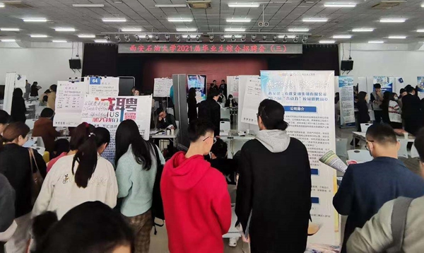 在鄠邑校区腾辉大学生活动中心举办了2021届毕业生第三场校园综合招聘会。中国石油天然气第六建设有限公司、中国石油工程建设有限公司华北分公司、陕西陕煤榆北煤业有限公司、中国华冶科工集团有限公司、陕西地矿第二综合物探大队有限公司、四川越盛油气田技术服务有限公司长庆分公司、陕西榆能化学材料有限公司等90余家单位、170余名代表参会。