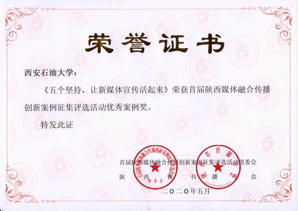 中心工作,讲好“西油故事”,凝聚“西油力量”,展示“西油形象”。先后荣获陕西宣传思想最高奖(陕西省宣传思想文化创新奖一等奖)、陕西新闻奖二等奖1项、全省党政干部优秀调研成果二等奖1项、陕西高校十佳好故事1项、中国高校校报好新闻奖2项、中国石油新闻奖二等奖2项、中国高校电视奖2项、全国高等院校全媒体“媒体融合类”优秀案例1项、陕西教育新媒体案例传播奖1项、陕西高校微信运营优秀奖等殊荣。