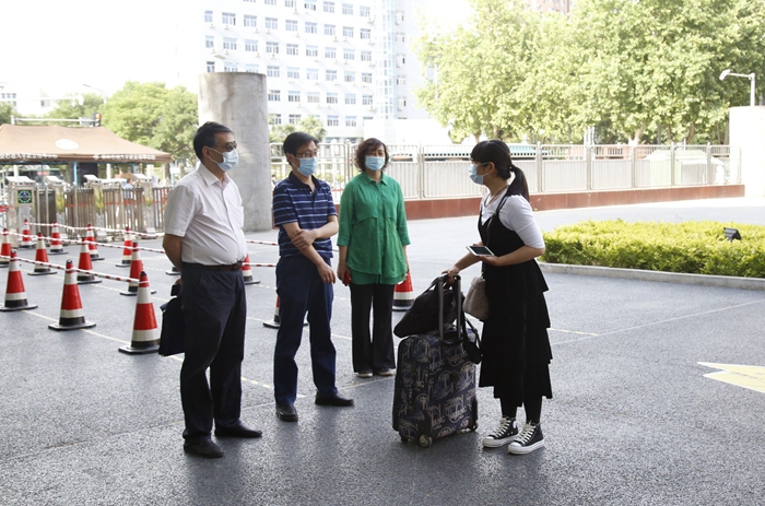 领导到报到区迎接返校同学,对返校同学表示欢迎,希望同学们返校之后继续做好自我防护,珍惜在校时光,安排好自己的学习、科研工作及日常生活。