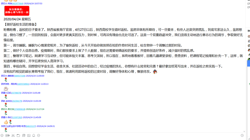 发出《给湖北籍西石大学子的一封信》,向身处疫区中心的学生送去母校的牵挂与抚慰,与湖北籍学生及家人一起抗疫。2月6日,发布《给陕西高校班级心理委员的倡议书》,并通过陕西省委教育工作委员会转发全省各高校,鼓励广大学生骨干充分发挥朋辈优势,携手互助,建立战“疫”情境中的心理互助,在国家危机时洋溢青春的力量。