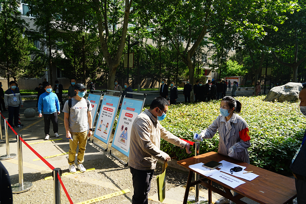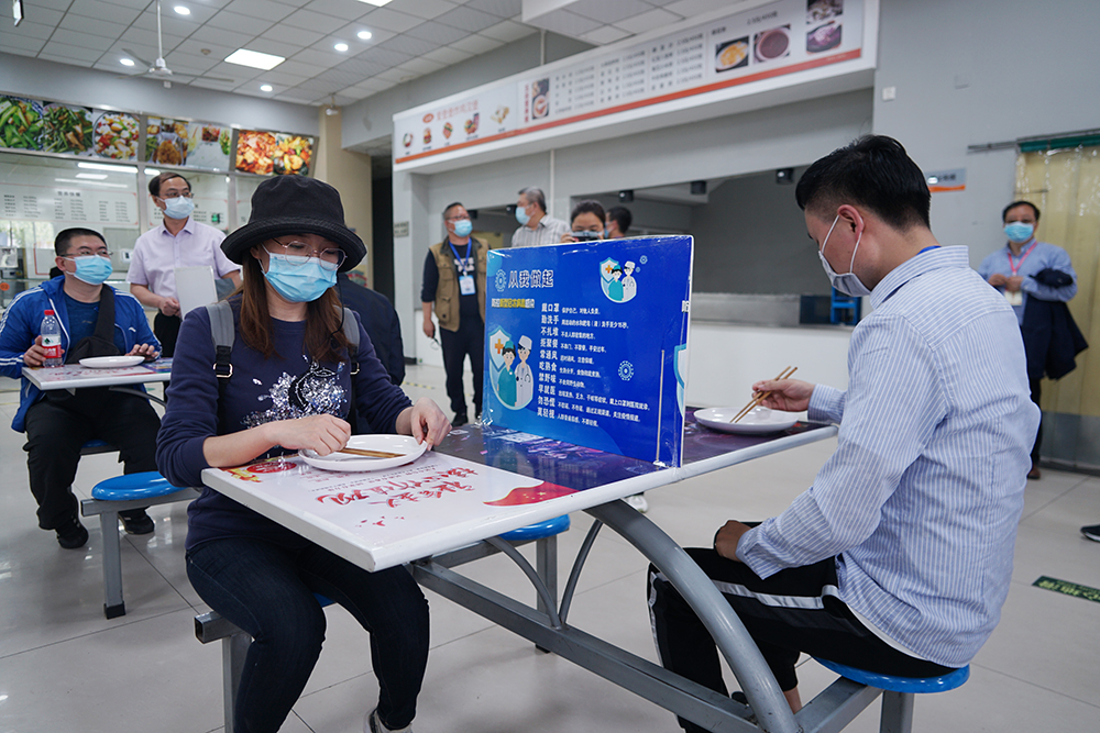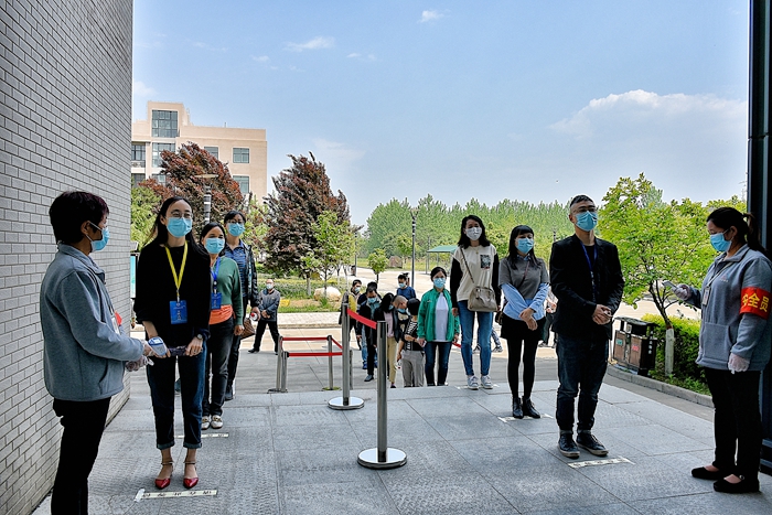 在食堂,演练按照事先制定的错时用餐、快速取餐、间隔就餐的方案,从间隔一米排队、测量体温、洗手取餐、间隔用餐到餐后离开食堂等,对整个用餐流程进行了模拟。在教室、实验室、图书馆等场所,也严格按照间隔一米排队、测量体温、靠右行走的程序演练。如发现体温异常学生,工作人员将其引导至临时留观点进行体温复测,若复测体温仍异常,工作人员逐级报告疫情防控工作领导小组,安排医生和救护车将体温异常学生送至隔离区。