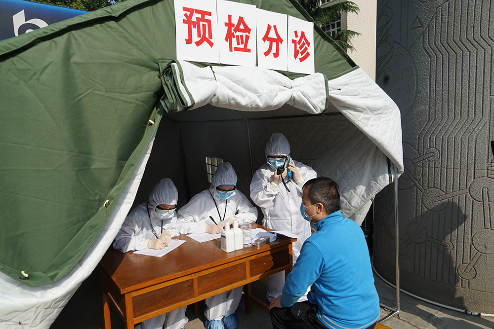 校长李天太下达演练开始命令。在雁塔校区南门和鄠邑校区东门,学生入校时按照地面标线,每人间隔一米,有序排好队伍准备入校,依次进行体温测量、身份核查、健康码查验。入校时一位同学在体温检测时发现异常,在现场工作人员带领下至临时留观区,由校医院医生仔细询问其身体状况,开展体温复测并记录,仍发现该学生体温异常,立即启动应急处置预案,逐级报告疫情防控工作领导小组,安排医生和救护车将体温异常学生送至隔离区。