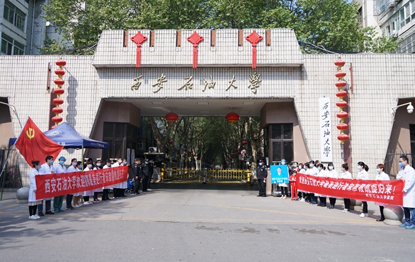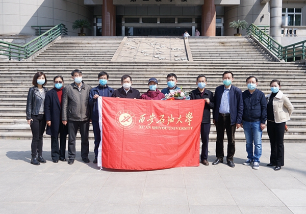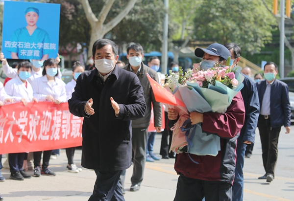 。校党政领导李天太、张木、苏文甫,相关部门负责人及校医院部分职工在雁塔校区东门迎接宋彦霞护士。