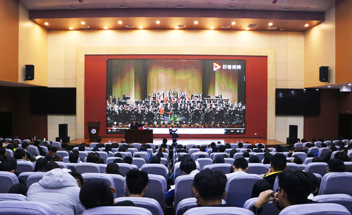 高贺杰老师以一幅图为引,延伸到声音。他指出,声音是传递信息的一种基本方式,声音延伸出音乐,“聪,耳闻而循心通上”,聪(听)是一个人智慧的标志。随后,高老师列举不同领域名家实例诠释音乐,并为同学们阐释了怎样听音乐以及听音乐的礼仪。他强调,音乐是需要想象力的,因为音乐的无造型性、无语义性,所以听声联想画面能更深层次的体会其内涵。最后,高老师为同学们播放并解析著名音乐家柴科夫斯基的《1812序曲》,使同学们感受到交响乐的魅力。