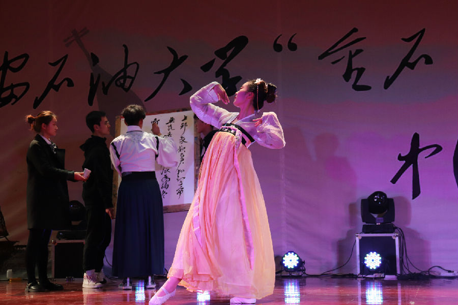 卢强老师带领两位学生在动听的中国古典音乐和舞蹈的背景下挥毫泼墨,创作了精彩的书法作品。