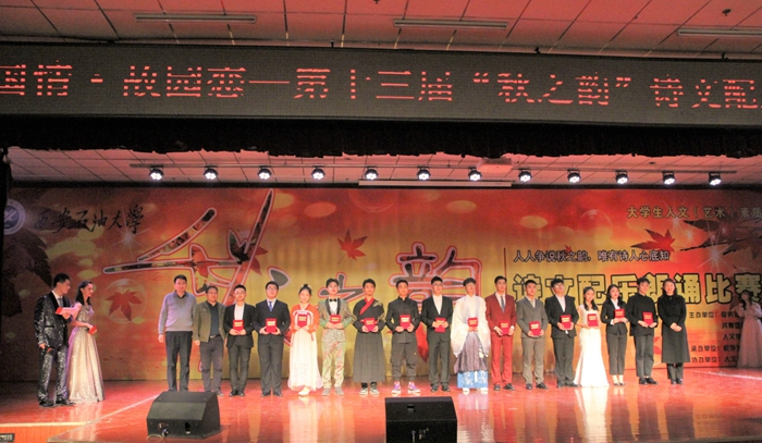 主办,校学生会承办,美学美育研究中心协办的“家国情•故园恋”第十三届“秋之韵”诗文配乐朗诵比赛(决赛)于鄠邑校区腾辉大学生活动中心举行。副校长程永清,相关院系、职能处室负责人与鄠邑校区400余名同学观看了比赛。