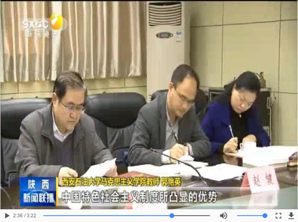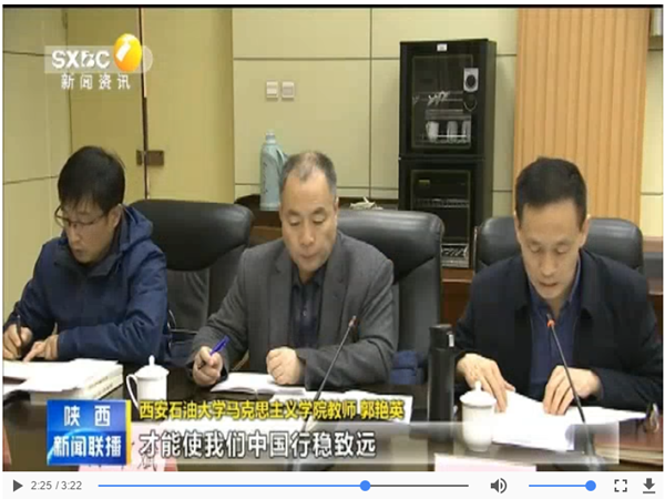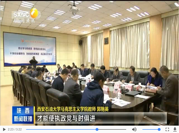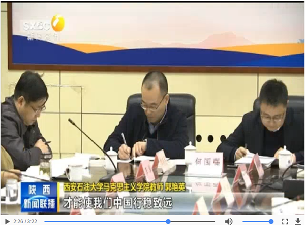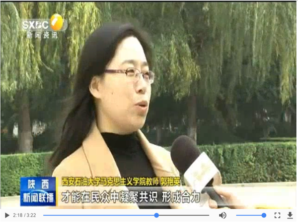 教师郭艳英。节目以《让党的十九届四中全会精神落地生根,为“中国之治”贡献智慧和力量》为题,分别在陕西电视台《陕西新闻联播》、陕西广播电台《全省新闻联播》中播出。