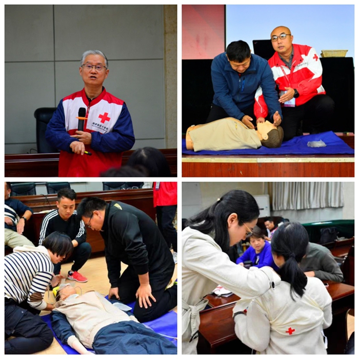 本次培训共分两批次进行,得到了各院(系)110余名教师的积极响应。来自陕西省红十字会的5位救护员培训师结合工作实际与现场救护案例,对红十字理念、救护新概念、心肺复苏术(CPR)、自动体外除颤仪(AED)、四项急救基本技能(止血、包扎、骨折固定及搬运)、常见急症、意外伤害等急救知识进行理论讲授与示范操作。