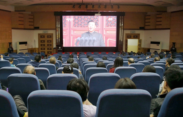习近平主席的讲话句句铿锵,直抵人心,“没有任何力量能够撼动我们伟大祖国的地位,没有任何力量能够阻挡中国人民和中华民族的前进步伐”,“中国的昨天已经写在人类的史册上,中国的今天正在亿万人民手中创造,中国的明天必将更加美好。”“不忘初心、牢记使命,继续把我们的人民共和国巩固好、发展好,继续为实现‘两个一百年'奋斗目标、实现中华民族伟大复兴的中国梦而努力奋斗!”等讲话在师生中引起热议。