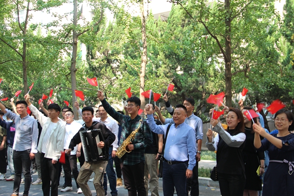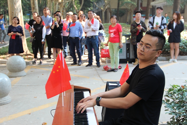 为庆祝新中国成立70周年,9月30日中午,音乐系师生在雁塔校区学生餐厅举办“红歌快闪”活动,吸引了校园中众多师生全场合唱。