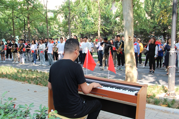 中午11时45分,音乐系100余名师生汇聚到雁塔校区学生餐厅门外。随着声乐教研室主任田立老师的现场伴奏,大家一边挥舞着五星红旗,一边唱起了歌曲《我和我的祖国》《歌唱祖国》。这两首慷慨激昂、振奋人心的经典红色歌曲,表达了德州扑克