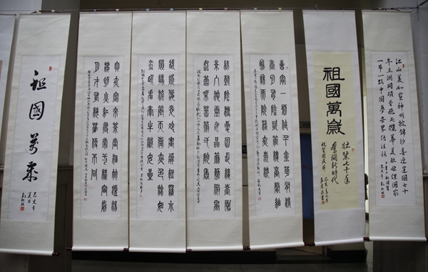 10余名书画爱好者精心创作的60余幅书画作品。创作者以手中的画笔热情赞颂伟大祖国的光辉成就,真情书写新中国成立70年的伟大历程。观众也被一幅幅精美的书画作品深深吸引,一起祝福伟大祖国繁荣昌盛。