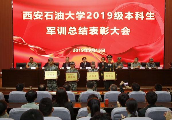 2019级本科生军训总结表彰大会在鄠邑校区弘石学术报告厅召开。校党政领导李天太、张木、陈军斌、樊晓民,军训旅旅长田伟利少校、参谋长蒋泽斌上尉出席大会。相关部门负责人,全体参训干部、教官代表以及2019级学生代表共400余人参加大会。