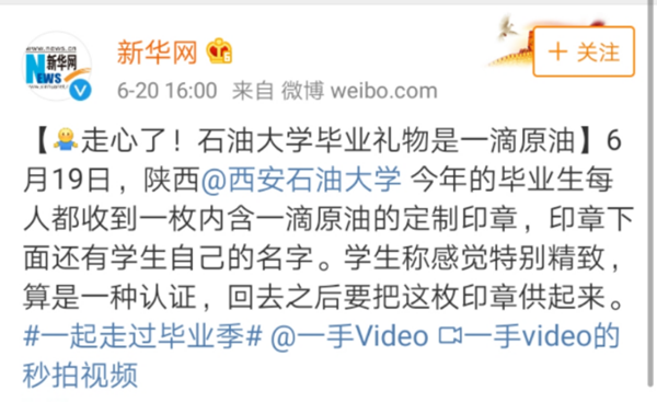 官方微信(小油)推出《独一无二!西石大2019届毕业礼物——“油情”2.0版很走心!》,在网络引起较大反响,光明网、华商网、陕西省教育厅微博等纷纷转载,网络阅读量上百万人次。6月20日,党委宣传部联合梨视频,持续用力,精心推出“一滴油印章”视频采访。节目一经推出,不到9个小时,收获1.8亿多人次的阅读量,仅微博话题“毕业礼物是一滴原油”阅读量1.7亿、讨论1.4万,微博话题及平台外,还有1000余万的阅读量,巨大阅读量为进一步提升德州扑克