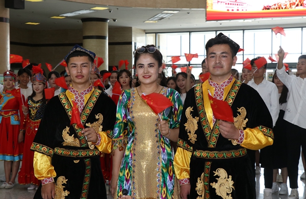 土木1803班麦扎提·吾拉音、电信1801班吐尔洪·托合提同学同时用维吾尔语和汉语表达了对祖国的热爱:“祝祖国繁荣富强!我爱你,中国!我爱你,我的祖国!”