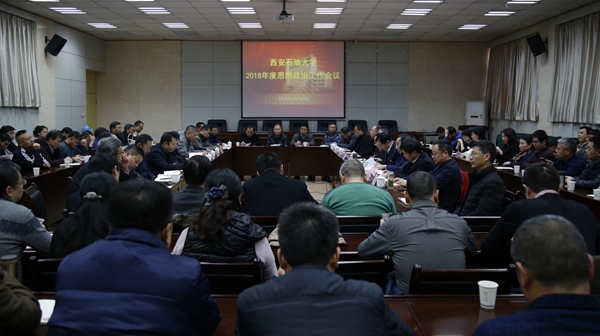 在雁塔校区第三会议室召开2018年度思想政治工作会。校党政领导赛云秀、李天太、李延平、张木、雷西合、杨战社、陈军斌、李华、程永清出席会议。全体正处级干部,各院(系)党委副书记、学管办主任、教师代表,学生工作处、校团委全体人员参加会议。校长、党委副书记李天太主持会议。