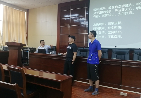 吟诵艺术国家级骨干教师、陕西师范大学何明家老师作了题为《教师教学发音技巧和嗓音保健》的讲座。他从人体发声器官解剖图入手,深入浅出地剖析了发声原理和影响人声音质的要素。他谈到,教师的职业要求决定了正确发声的必要性,一定要重视嗓音保健。他现场为发言的老师评估音质,分析发音存在的问题,结合现场案例,帮助青年教师正确理解发声机理和运用嗓音的技巧,并耐心传授稳定、协调、平衡发声的技巧。