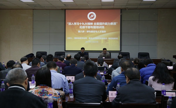 “深入学习党的十九大精神,全面提升能力素质”处级干部专题培训班第七讲、第八讲在雁塔校区会议中心第三会议室举办。陕西高等教育学会副会长、副秘书长,西北大学高等教育研究中心主任姚聪莉教授;国家级教学名师、西北大学研究生院院长赖绍聪教授应邀来校作报告。报告会由党委副书记雷西合主持,全校处级干部参加报告会。