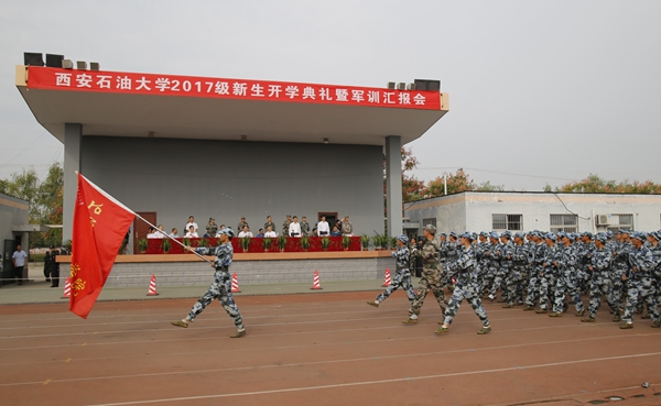 开学典礼暨军训汇报会在激昂的国歌声中拉开了序幕。伴随着嘹亮的口号,2017级新生们在各院(系)辅导员的带领下迈着整齐矫健的步伐,精神饱满地经过主席台,接受校领导的检阅。随后,新生们还进行了擒敌拳方阵、武警舞步操方阵、匕首操方阵、舞旗擒敌配套方阵、战术解救人质演习、石油学子花样队形等科目的表演。