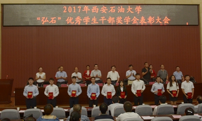 2017年“弘石”优秀学生干部奖学金表彰大会在鄠邑校区图书馆弘石学术报告厅举行。副校长、校友总会副会长、教育基金会副理事长李天太,80级校友、“弘石”基金委员会理事会副理事长、宝鸡迪然石油技术发展有限公司总经理单勇,弘石基金委员会委员、机械工程德州扑克