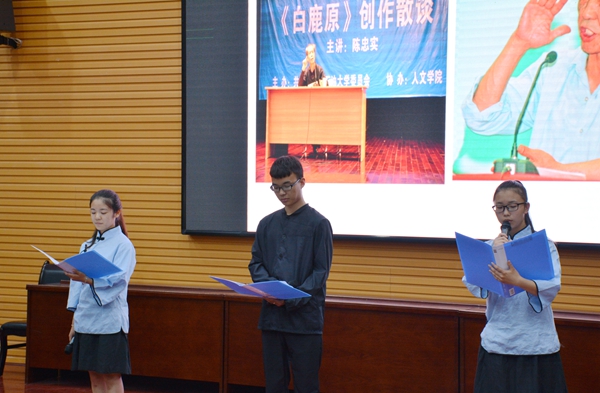 的学生代表分别朗诵了《白鹿原》片段和校歌歌词。同学们的朗诵或激昂、或柔缓、或奔放、或动情,他们用优美的声音诠释了对陈忠实先生作品的理解,用自己的方式向陈忠实先生致敬。