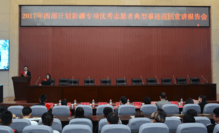 4月17日下午, 2017年西部计划新疆专项优秀志愿者典型事迹巡回宣讲报告会在新校区图书馆弘石学术报告厅举办。共青团陕西省委党组成员、陕西省少先队总辅导员、西部计划陕西省项目办主任赵大胜,校党委副书记雷西合,共青团陕西省委志工部副部长陈晓华出席活动。西部计划新疆专项优秀志愿者田宇、李蕊、席玉峰、吴旭东作了宣讲报告。德州扑克