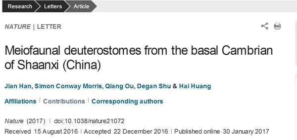黄海副教授与西北大学早期生命研究团队、剑桥大学、中国地质大学(北京)等单位合作研究的重要成果——《陕西寒武纪最早期的微型后口动物》。