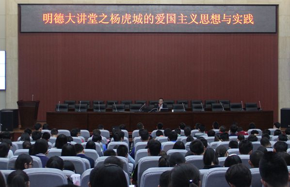 团委承办的第41期明德大讲堂之《杨虎城的爱国主义思想与实践》在新校区图书馆弘石报告厅举办。爱国将领杨虎城将军之孙——杨瀚先生担任主讲,新校区四百余名师生参加了讲座。